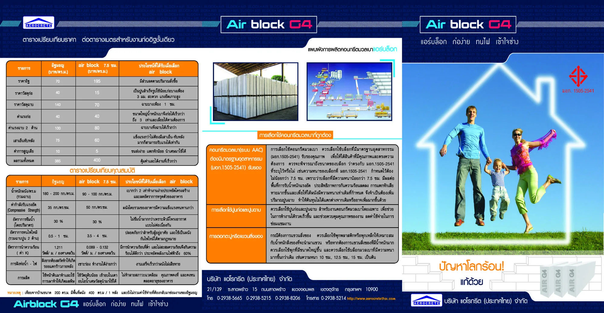 แอร์บล็อก Airblock เป็นผลิตภัณฑ์ชิ้นส่วนคอนกรีตมวลเบา แบบมีฟองอากาศ – อบไอน้ำ (Autoclaved Aerated Lightweight Concrete Elements) ซึ่งผ่านการรับรองจากสำนักงานมาตรฐานผลิตภัณฑ์อุตสาหกรรม กระทรวงอุตสาหกรรม (มอก. 1505-2541) คุณสมบัติพิเศษคือ มีน้ำหนักเบา, แข็งแรง, ป้องกันเสียง, ทนความร้อนได้ถึง 4 ชม.